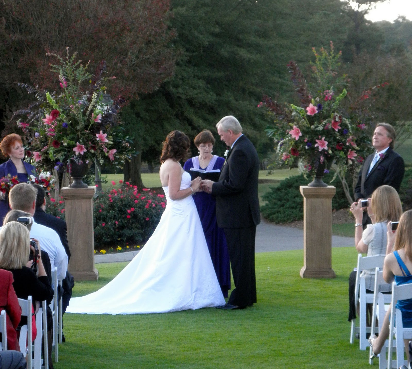 Paula and Tim met with me last April about officiating their wedding set for October 22, 2011 at the lovely Raleigh Country Club. They had met back in 2007 through a professional dating service that set them up for a lunch date. The match was truly amazing. Their lunch date lasted 4 hours because they were so comfortable with each other and conversation was natural and easy. Tim told me that he had been looking for the perfect woman for him for 22 years and was thrilled to have found her at last! Paula was delighted to find a man who was emotionally supportive and has now checked that off her bucket list! They have had many fun adventures together and look forward to marriage as a new and wonderful adventure knowing that they can handle any challenges life may throw their way.