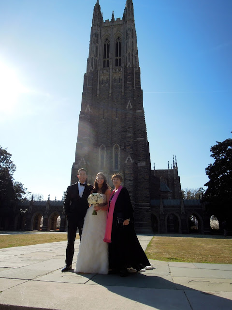 The big day arrived and it was glorious weather for which we were all grateful having had such unusual weather so far in 2013. Before the wedding, Kate and Steve and their photographer, Terry with Carolina Mediastar, staged a "first look" at Duke Gardens. So after that there was no hiding the bride from the groom and when we arrived, the bride and groom and bridesmaids were taking pictures in front of the beautiful chapel.
